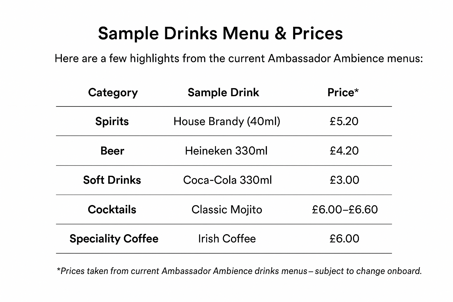 Bars on Ambassador Ambience: Drinks Menus, Prices & Packages 2025-2026