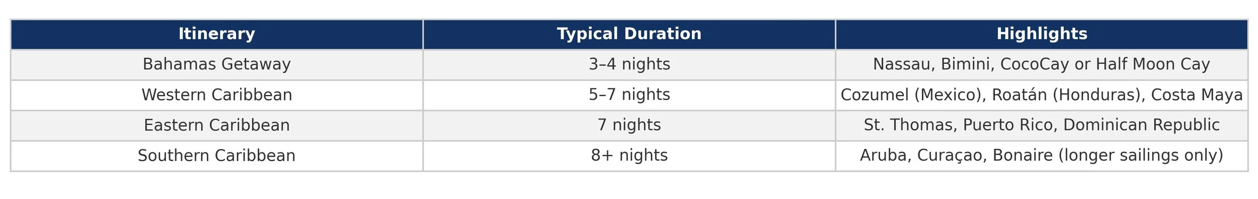 Typical itinerary: 7-night Caribbean sailings plus 1–2 nights in Miami.