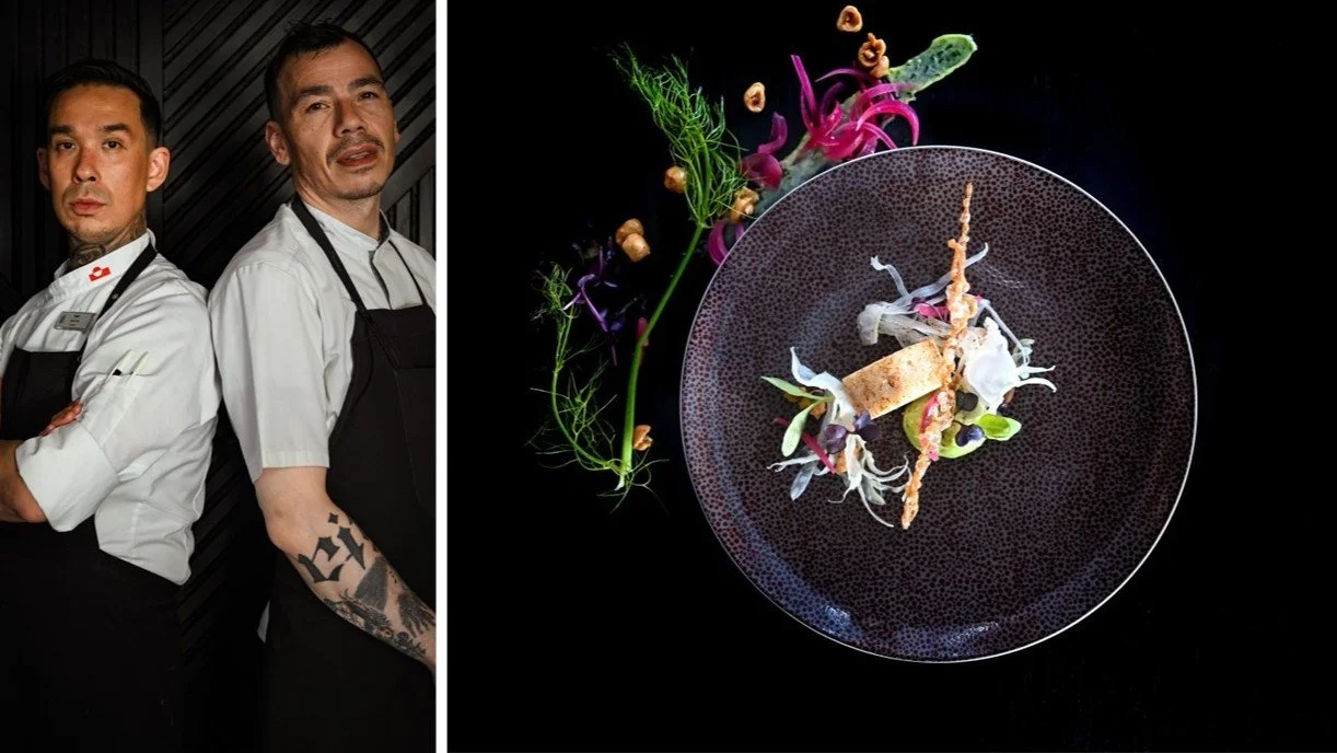 Chef Laasi Biilmann, left, and Chef Inunnguaq Hegelund, two local chefs who launched HX’s Greenlandic culinary program, which will expand in 2027/28; right: Scallop terrine with apple, a dish Chef Hegelund created for the inaugural Greenlandic menu. Photos: HX