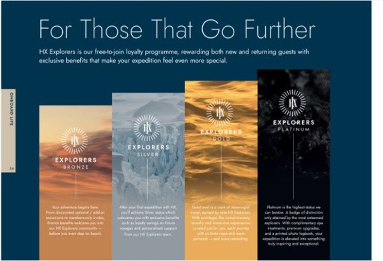 The new season also sees the evolution of the HX Explorers Loyalty Programme, designed “for those that go further.” Featuring four tiers -Bronze, Silver, Gold, and Platinum - the enhanced programme introduces a points-based system rewarding travellers for every night at sea, onboard activity, and even select experiences at home.