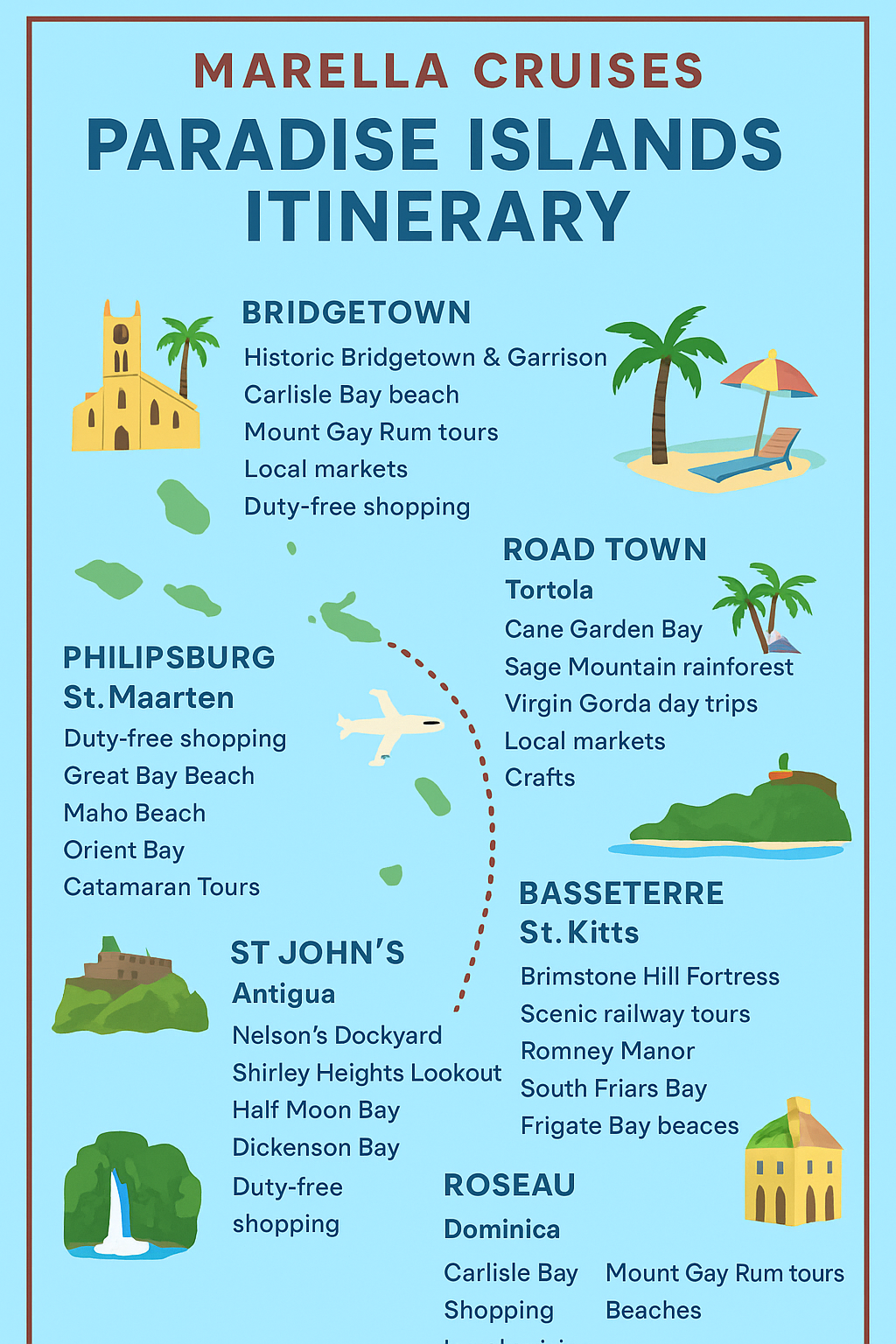 Marella’s Paradise Islands is a seven-night fly-cruise round-trip from Barbados, visiting some of the Caribbean’s most loved islands. Expect days filled with turquoise waters, colourful colonial towns, rum cocktails, and some of the best beaches in the world. Each stop offers a mix of relaxation and adventure — whether you want to explore a rainforest, tour a historic fort, or spend a lazy day on the sand.