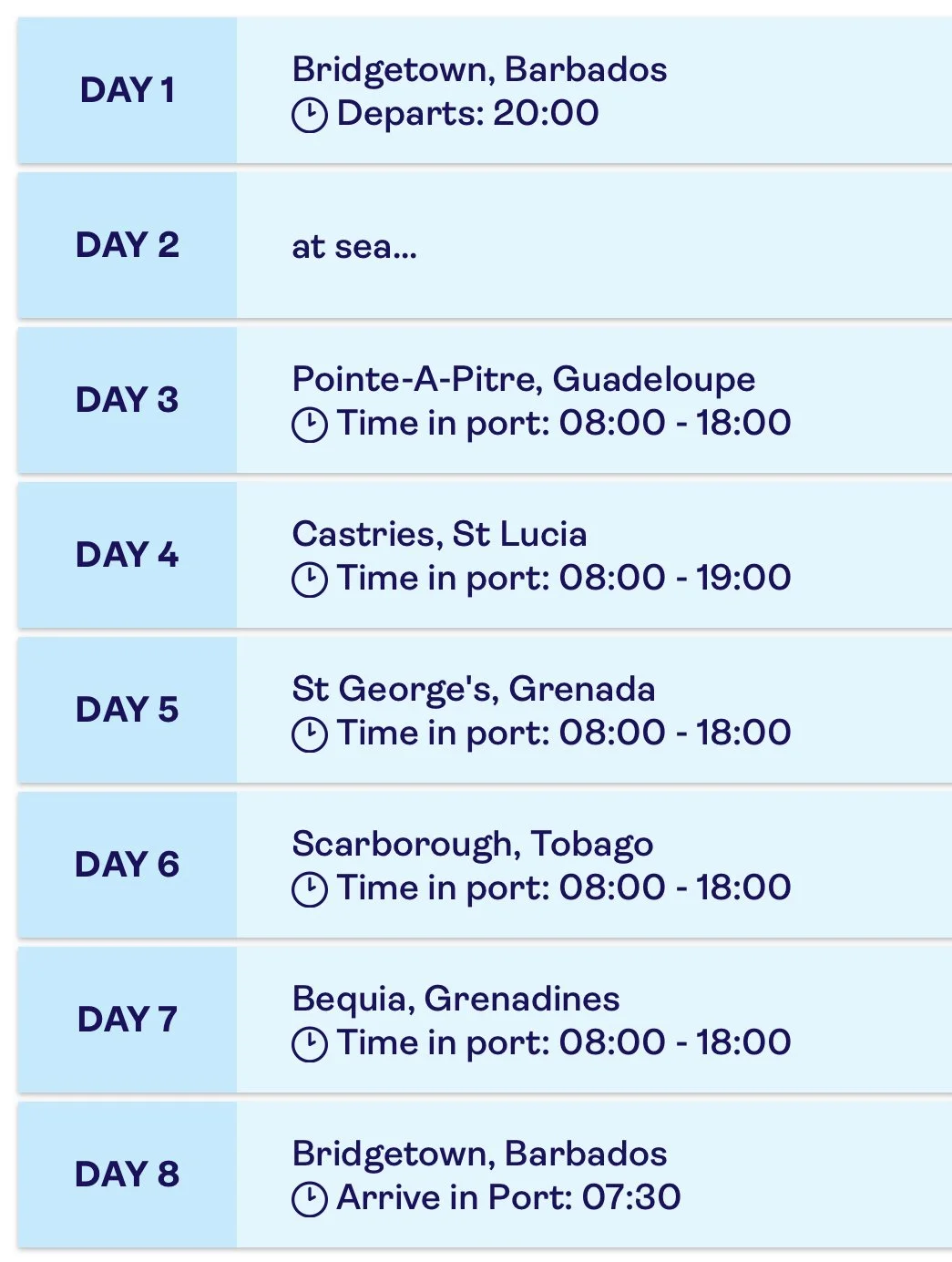 Marella’s Taste of the Tropics is a 7-night Caribbean fly-cruise roundtrip from Bridgetown, Barbados, designed to showcase some of the region’s most beautiful and contrasting islands. From spice-scented markets to rainforest peaks and powdery white beaches, this itinerary delivers a true Caribbean experience.