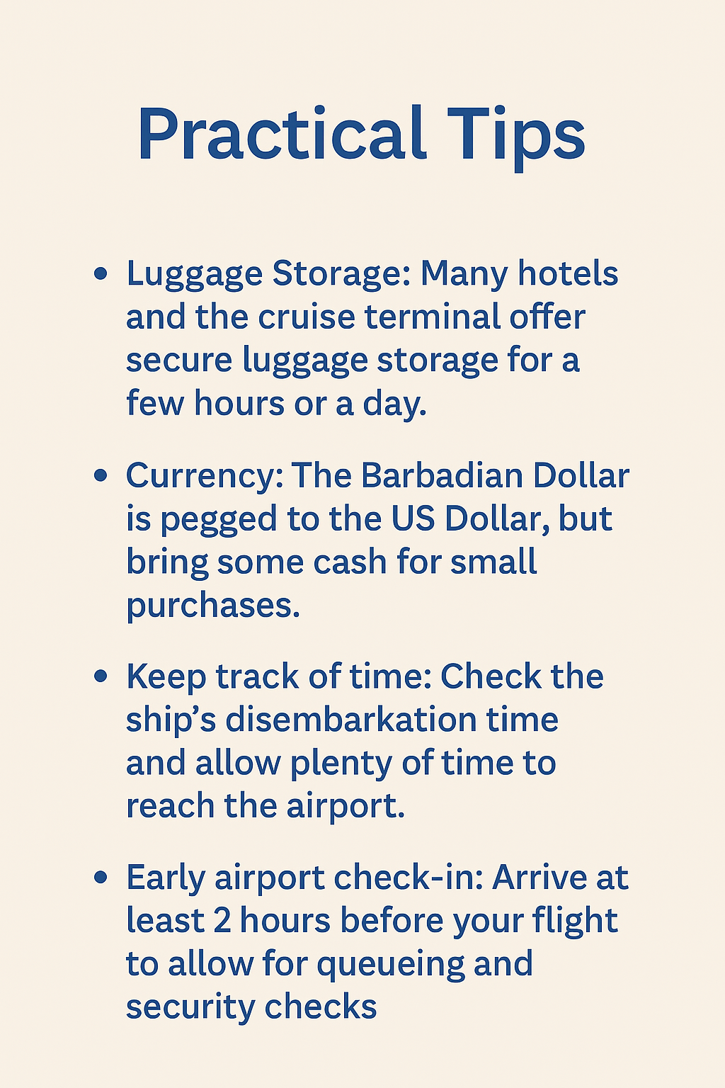 👉 Tip: If you have several hours before your flight, storing luggage at the terminal or arranging a hotel day pass is the easiest way to enjoy Barbados stress-free.