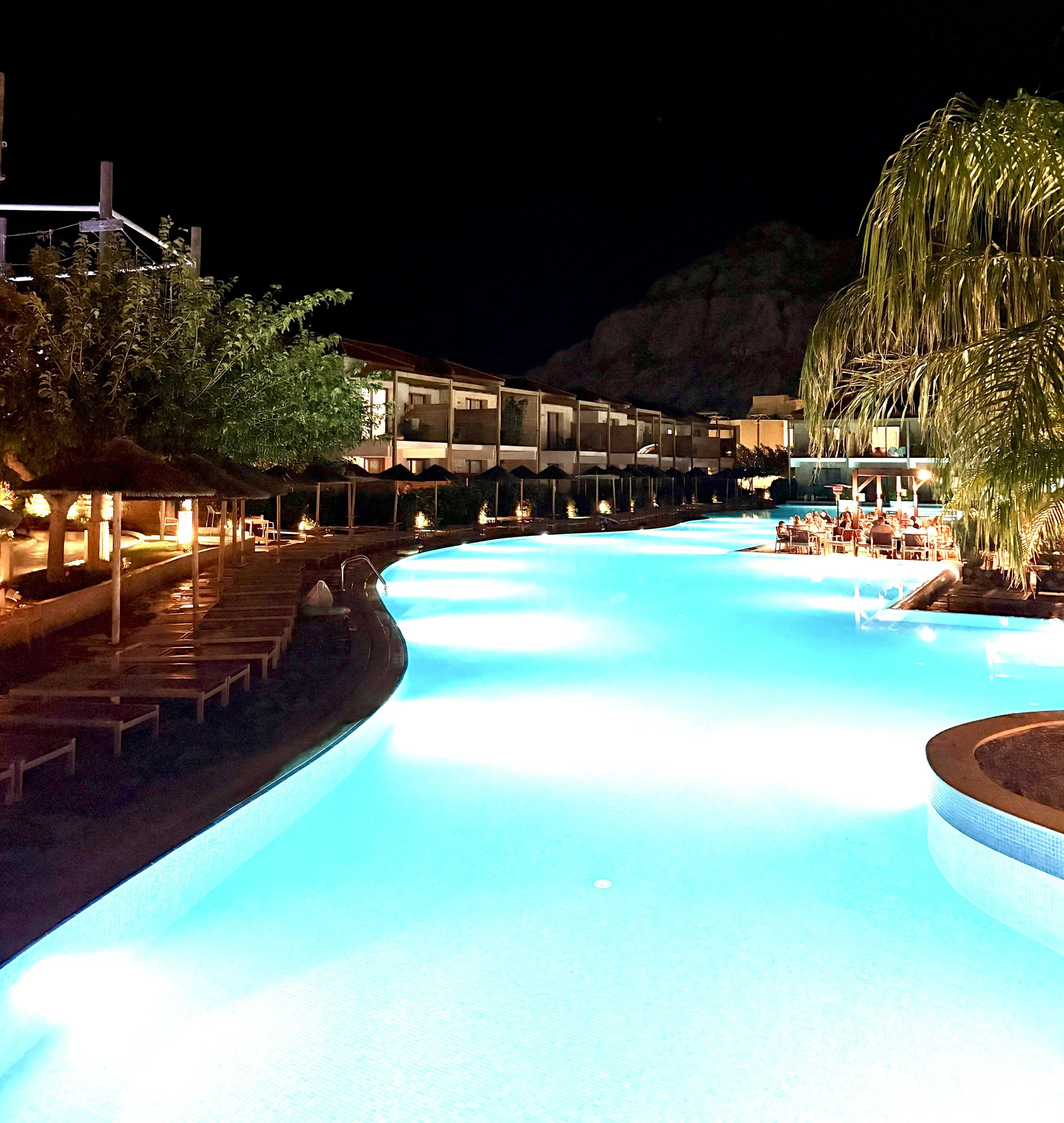 The Activity Pool Nightime view at Holiday Village Atlantica Rhodes