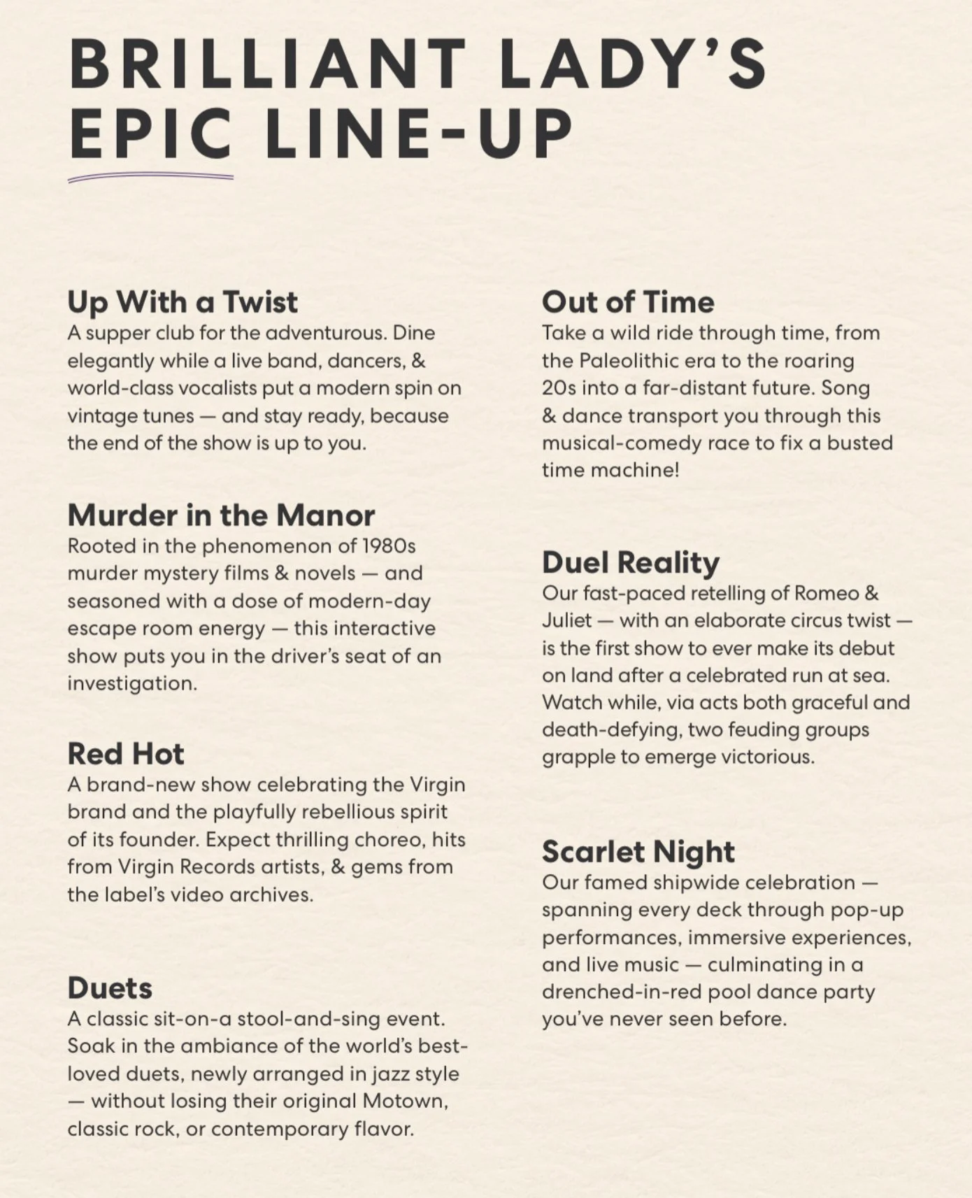 Virgin is known for its edgy, immersive entertainment, and Brilliant Lady comes armed with a whole new line-up. Seven new shows will debut onboard, including: