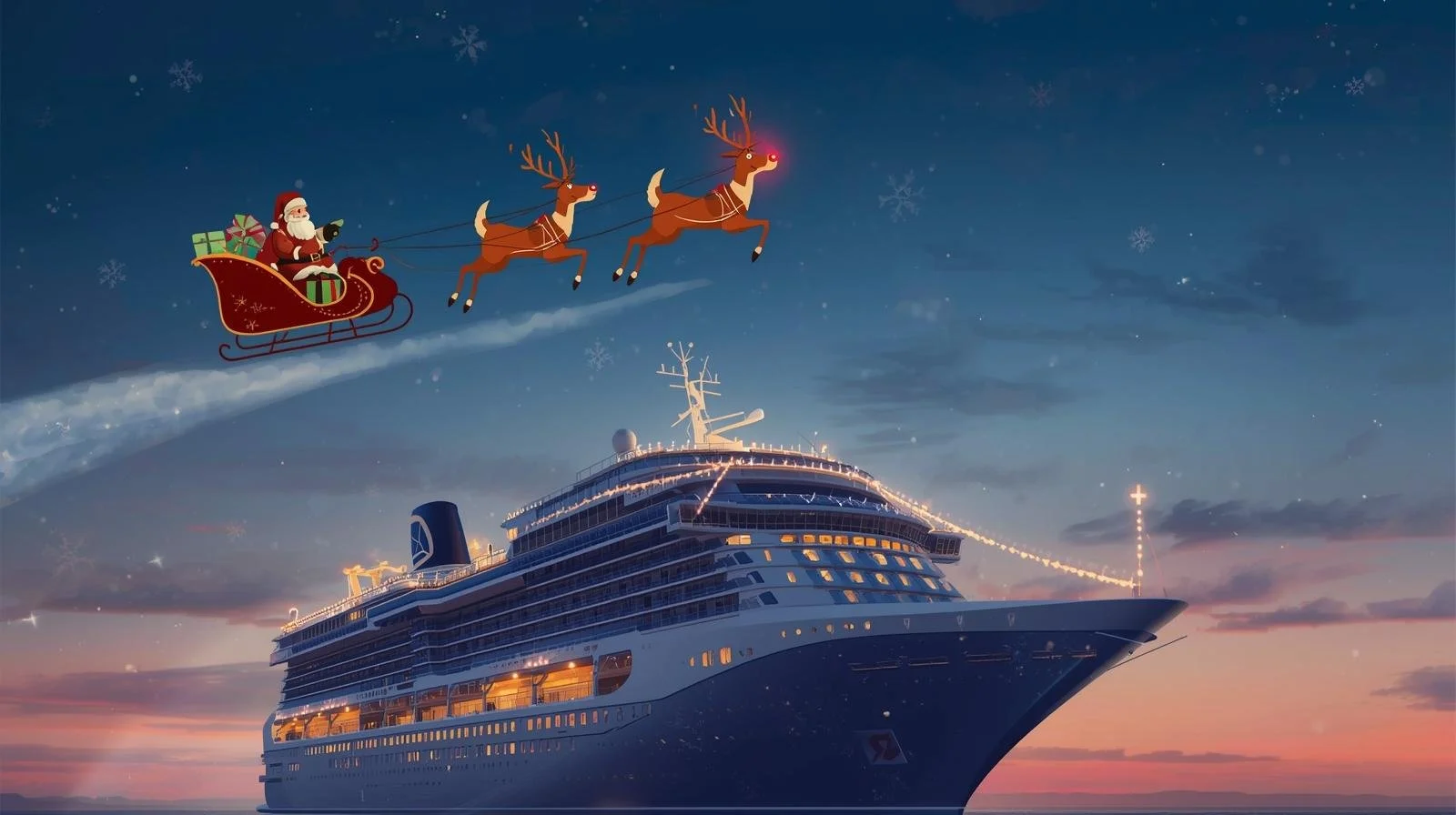 Santas sleigh over cruise ship.