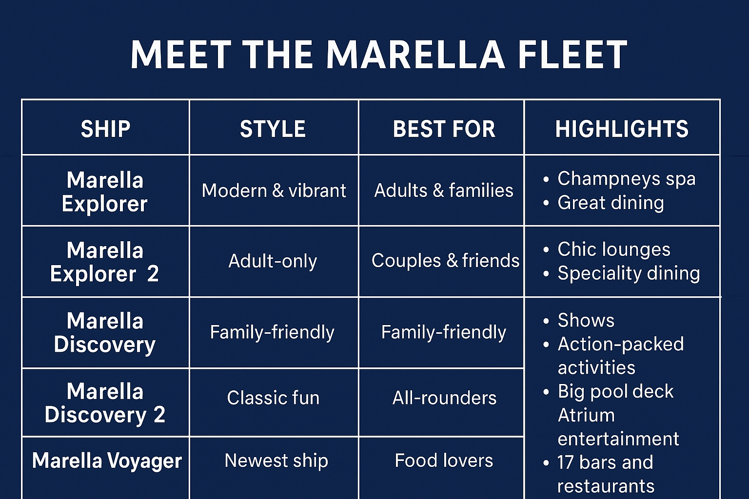Meet the Marella fleet - table showing ships currently sailing for Marella Cruises